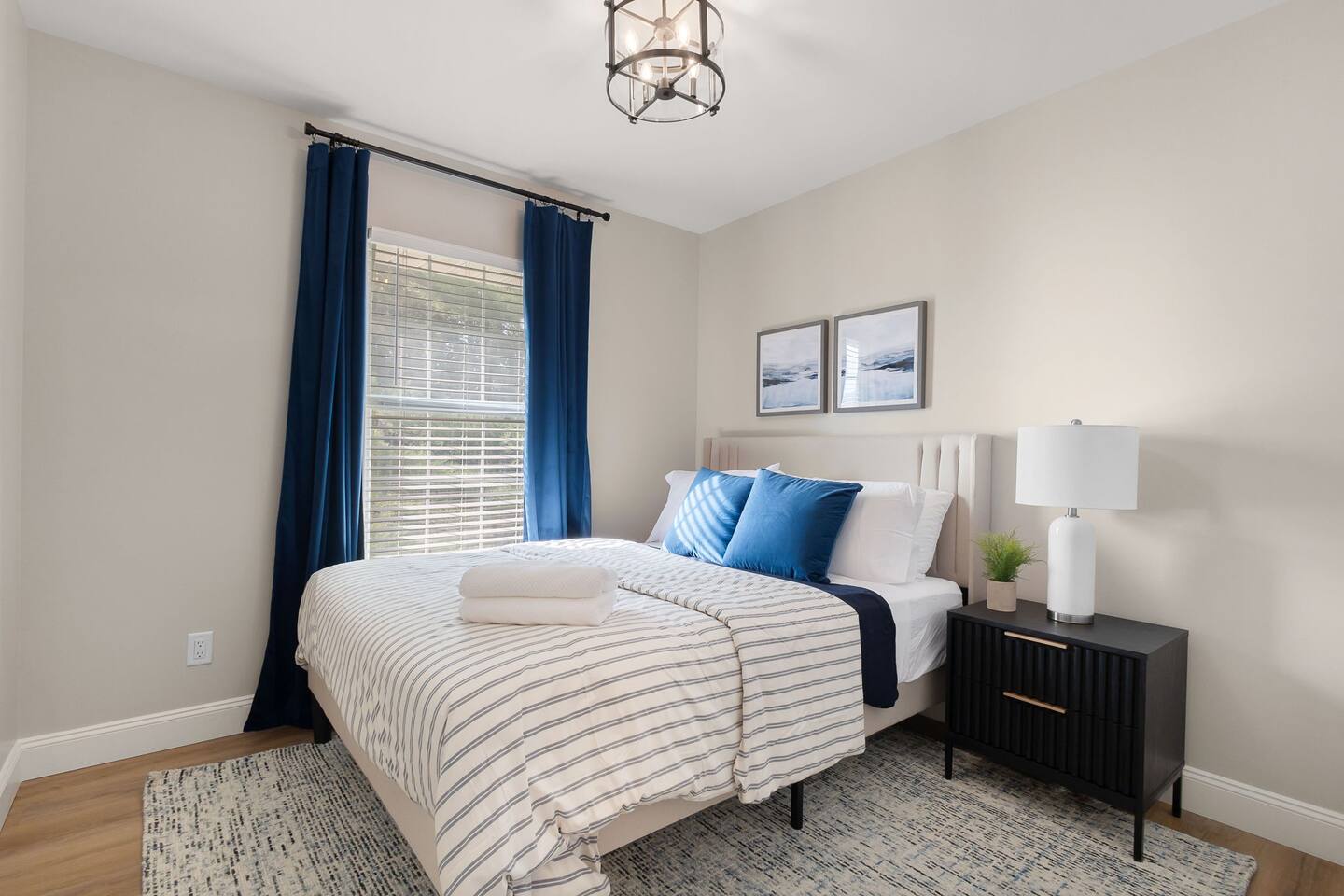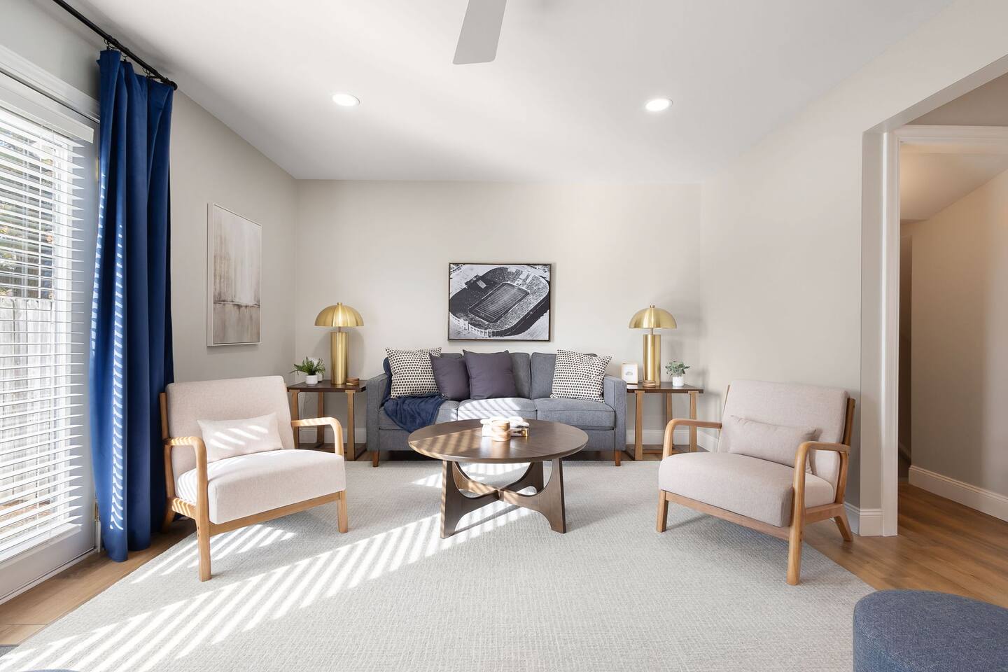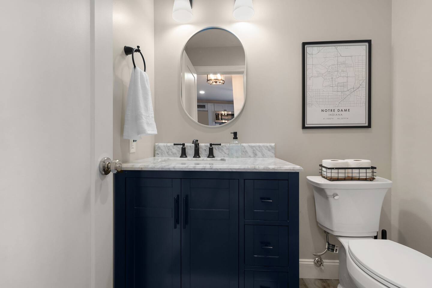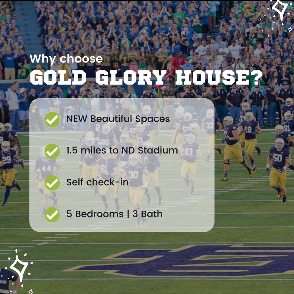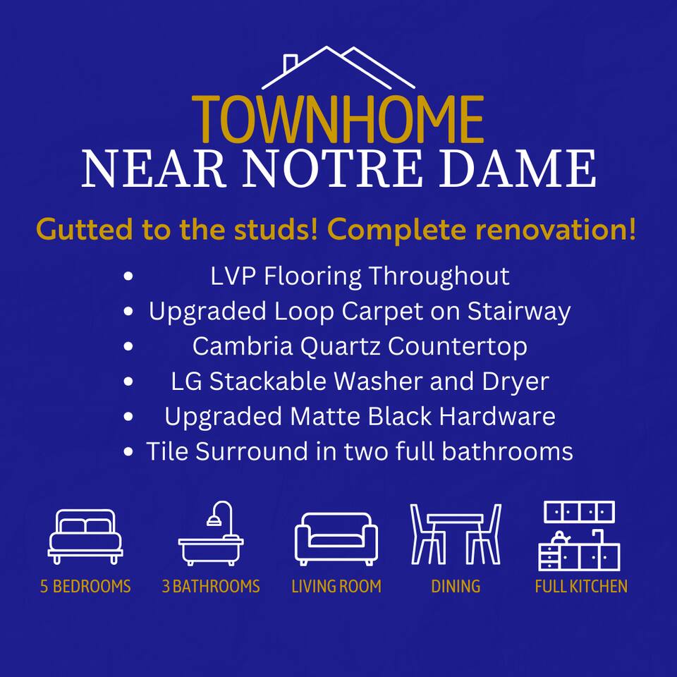 WHY YOU’LL LOVE GOLD GLORY TODAY! (Besides everything being new…) This THREE-level townhome has 3 bedrooms upstairs and 2 downstairs, each with queen beds, clean designs, and thoughtful touches: makeup towels, Puracy body wash/shampoo/conditioner, hair dryer, and clothes steamer. BATHROOMS Three bathrooms: half bath on the main level, 3/4 bath upstairs, full bath downstairs. Sleek tile backsplashes, modern minimalist design, and an open, airy feel. Primary shower upstairs has a clear glass door—spa vibes included. KITCHEN Fully stocked with everything you need: pots, pans, plates, glasses, utensils, and appliances. Coffee lovers rejoice—drip coffee, single-serve Keurig, coffee, sugar, and creamer ready for your morning. LIVING ROOM Open concept for togetherness—chat with friends in the kitchen, at the table, or while streaming content on the smart TV. Board games included… and yes, you might question your spouse’s competitive streak. BACKYARD Green space perfect for grilling or a game of cornhole (“Bags” for the Minnesotans!). Solid American-made boards, resin Adirondack chairs, and camping chairs for easy gathering. LOCATION Just 1.5 miles from the buzzing University of Notre Dame area—shops, cafes, eateries, and campus. Football game, visit, or convention? Century Center is 5 minutes away. Need downtime? Take a stroll on the scenic Riverwalk. NEIGHBORHOOD Conveniently central, which means you may hear traffic during peak hours—It’s all part of the vibrant atmosphere that comes with being in such a central location! Thanks for checking out Gold Glory! We look forward to welcoming you and your crew.